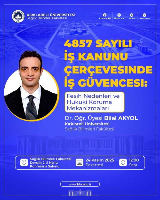 Üniversitemiz Sağlık Bilimleri Fakültesi tarafından, 24 Kasım 2025 Pazartesi günü saat 12.00’de, II. Merkezi Derslik 2 No’lu Konferans Salonunda “4857 Sayılı İş Kanunu Çerçevesinde İş Güvencesi: Fesih Nedenleri ve Hukuki Koruma Mekanizmaları” konulu seminer gerçekleştirilecektir.