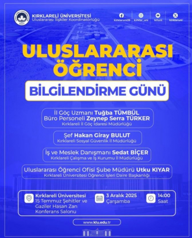 Kırklareli Üniversitesi Uluslararası İlişkiler Koordinatörlüğü tarafından uluslararası öğrencilerin Türkiye’deki yasal yükümlülükler, sosyal güvenlik hakları ve üniversite içi süreçler konusunda bilgilendirilmesini amaçlayan “Uluslararası Öğrenci Bilgilendirme Günü” düzenlenecektir. Etkinlik, 3 Aralık 2025 Çarşamba günü Saat 14.00’te Hasan Zan Konferans Salonu’nda gerçekleştirilecektir.