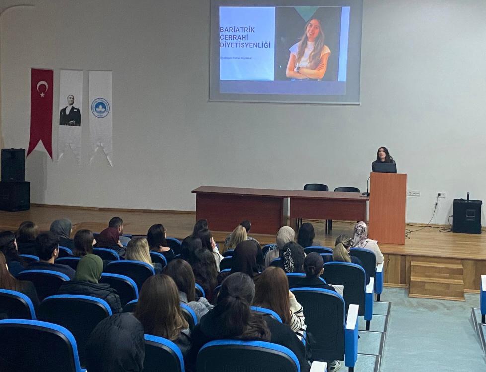 Moderatörlüklerini Dr. Öğr. Üyesi Gökçe Çakmak Kafadar ve Arş. Gör. Dr. Selma Fırat yürüttüğü etkinliklerden ilki, 24 Kasım 2025 tarihi saat 19:00’da çevrimiçi gerçekleştirildi. Etkinlikte, 2023 yılı mezunlarından Tekirdağ Hayrabolu Devlet Hastanesi’nde Diyetisyen olarak görev alan Kübra Kurt “Devlet Hastanesinde Diyetisyen Olmak” başlıklı sunumunda multidisipliner çalışma deneyimlerinden ve etik ilkelere bağlılığın mesleki süreçlerdeki öneminden bahsetti. Etkinliklerden ikincisi, 25 Kasım 2025 tarihi saat 14:00’te 2023 yılı mezunlarından Tekirdağ Ergene Belediyesi’nde Diyetisyen olarak görev yapan İpek Melisa İmre tarafından, sonuncusu ise saat 15:00’de 2023 yılı mezunlarından Tekirdağ Morsanita Kliniğinde Diyetisyen olarak görev yapan Bahar Küçükkul tarafından Sağlık Bilimleri Fakültesi Konferans Salonu’nda yüz yüze gerçekleştirildi. İmre, halk sağlığı alanındaki saha projelerini ve toplum temelli beslenme uygulamalarını anlatarak sahada diyetisyen olmanın önemini vurguladı. Küçükkul ise, obezite cerrahisi sonrası beslenme yönetimi, klinik beslenme protokolleri ve Erasmus deneyiminin mesleki katkılarını öğrencilerle paylaştı.