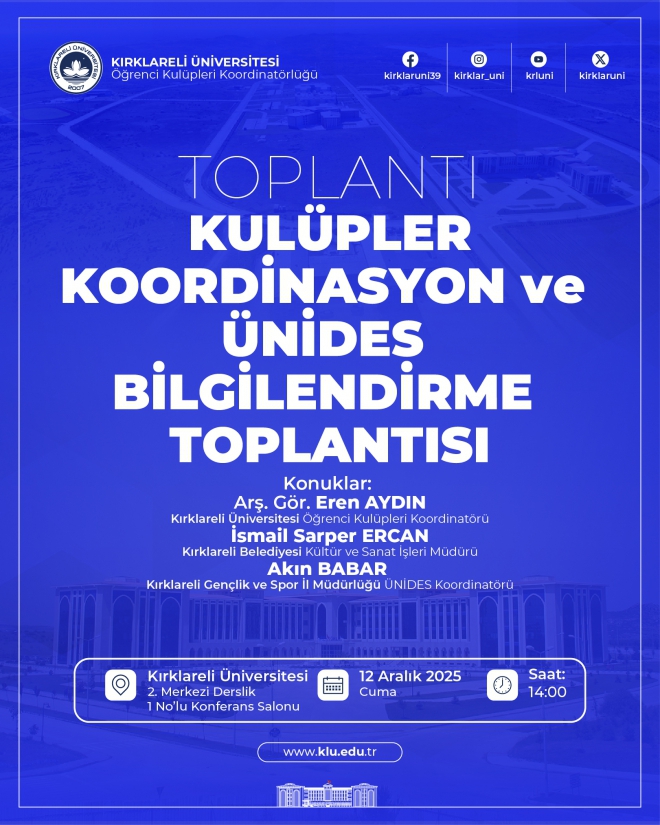 Üniversitemiz Öğrenci Kulüpleri Koordinatörlüğü tarafından, öğrenci kulüplerimizin işleyişine yönelik güncel süreçlerin paylaşılması ve ÜNİDES Programı hakkında bilgilendirme yapılması amacıyla “Kulüpler Koordinasyon ve ÜNİDES Bilgilendirme Toplantısı” düzenlenecektir.