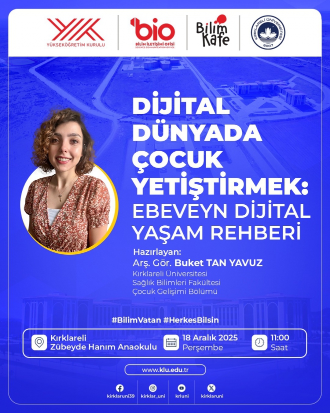 Üniversitemiz Bilim İletişimi Ofisi tarafından, Yükseköğretim Kurulu (YÖK) Bilim Kafe etkinlikleri kapsamında “Dijital Dünyada Çocuk Yetiştirmek: Ebeveyn Dijital Yaşam Rehberi” başlıklı etkinlik gerçekleştirilecektir.