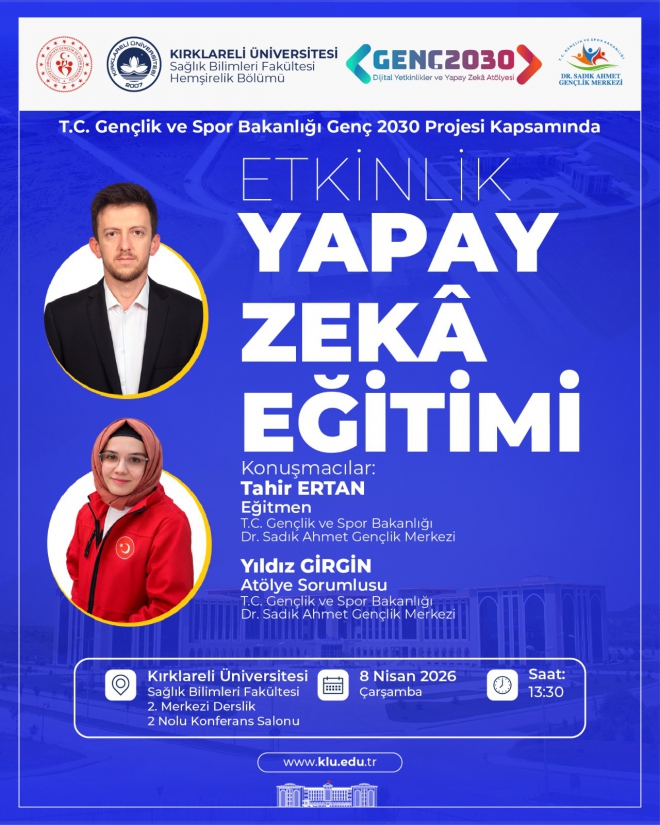 Etkinlik, 8 Nisan 2026 Çarşamba günü saat 13.30’da Kırklareli Üniversitesi Sağlık Bilimleri Fakültesi 2. Merkezi Derslik 2 Nolu Konferans Salonu’nda gerçekleştirilecektir.