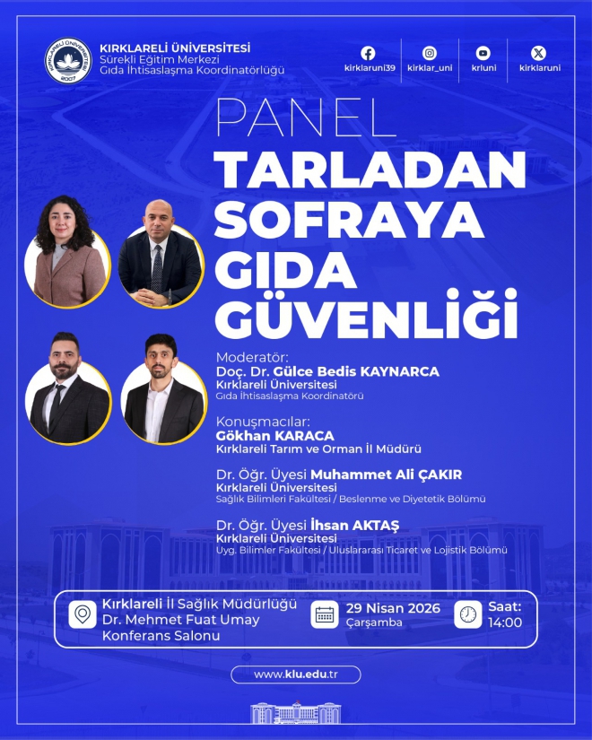 Gıda güvenliğinin üretimden tüketime kadar tüm aşamalarının ele alınacağı panel, 29 Nisan 2026 Çarşamba günü saat 14.00’te, Kırklareli İl Sağlık Müdürlüğü Dr. Mehmet Fuat Umay Konferans Salonu’nda gerçekleştirilecektir.